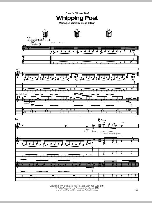 Download or print Allman Brothers Band Whipping Post sheet music, chords and digital score arranged for Guitar Tab. This Blues score includes 13 page(s).