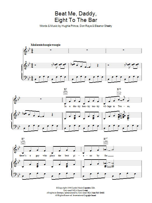 Download or print The Andrews Sisters Beat Me Daddy, Eight To The Bar sheet music, chords and digital score arranged for Piano, Vocal & Guitar Chords (Right-Hand Melody). This Jazz score includes 4 page(s).