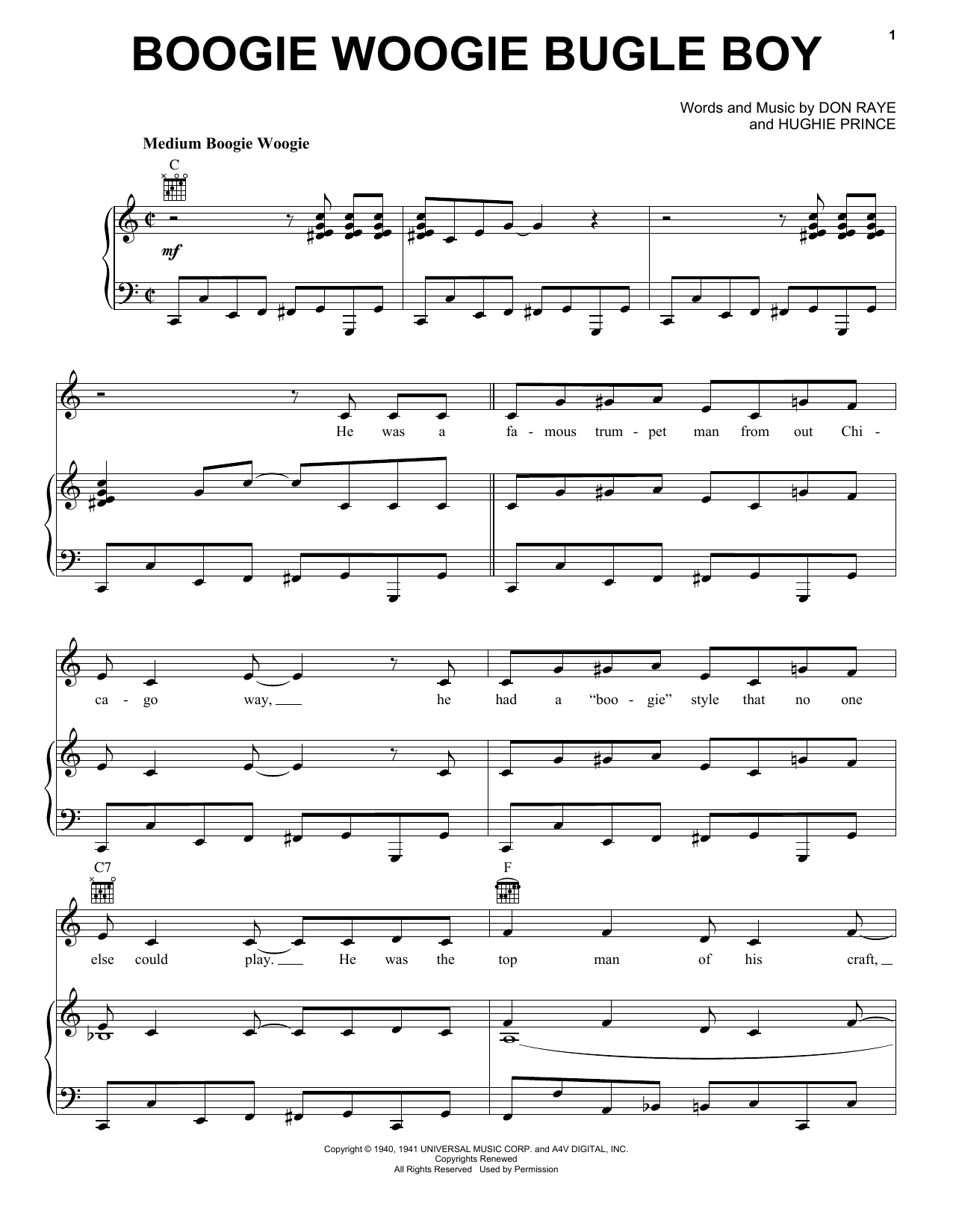 Download or print The Andrews Sisters Boogie Woogie Bugle Boy sheet music, chords and digital score arranged for Piano, Vocal & Guitar Chords (Right-Hand Melody). This Jazz score includes 4 page(s).