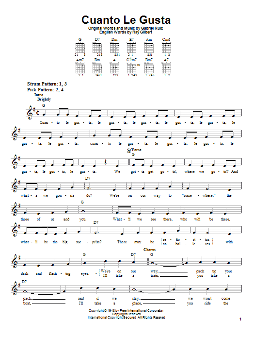 Download or print The Andrews Sisters Cuanto Le Gusta sheet music, chords and digital score arranged for Piano, Vocal & Guitar Chords (Right-Hand Melody). This Latin score includes 5 page(s).