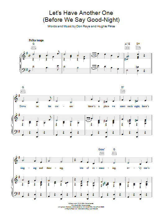 Download or print The Andrews Sisters Let's Have Another One sheet music, chords and digital score arranged for Piano, Vocal & Guitar Chords. This Standards score includes 5 page(s).