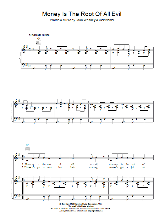 Download or print The Andrews Sisters Money Is The Root Of All Evil sheet music, chords and digital score arranged for Piano, Vocal & Guitar Chords. This Standards score includes 5 page(s).