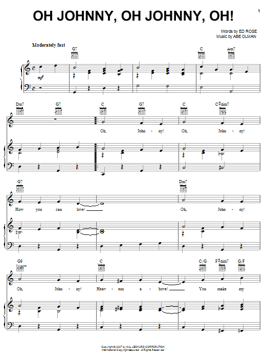 Download or print The Andrews Sisters Oh Johnny, Oh Johnny, Oh! sheet music, chords and digital score arranged for Piano, Vocal & Guitar Chords (Right-Hand Melody). This Jazz score includes 3 page(s).