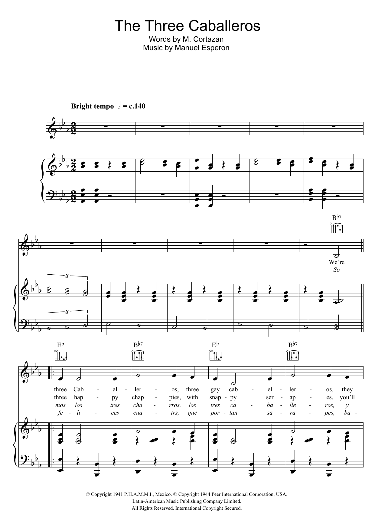 Download or print The Andrews Sisters The Three Caballeros sheet music, chords and digital score arranged for Piano, Vocal & Guitar Chords. This Pop score includes 5 page(s).