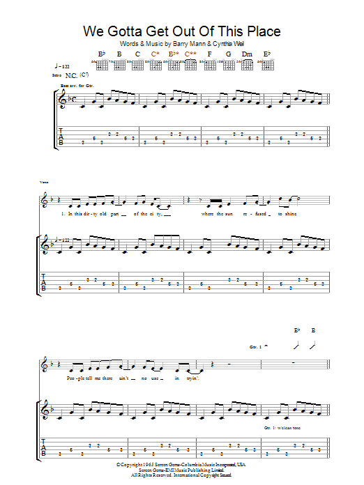 Download or print The Animals We Gotta Get Out Of This Place sheet music, chords and digital score arranged for Guitar Chords/Lyrics. This Pop score includes 3 page(s).