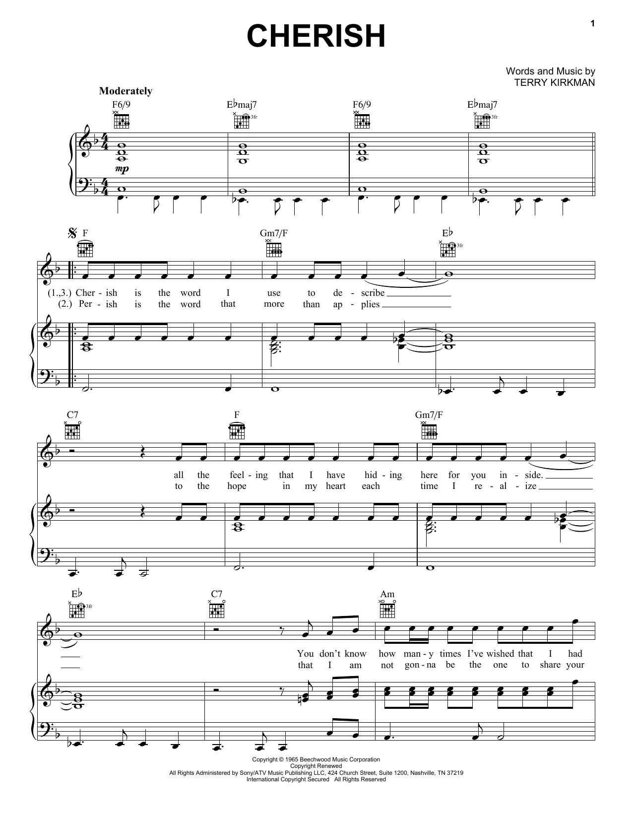Download or print The Association Cherish sheet music, chords and digital score arranged for Easy Piano. This Pop score includes 5 page(s).