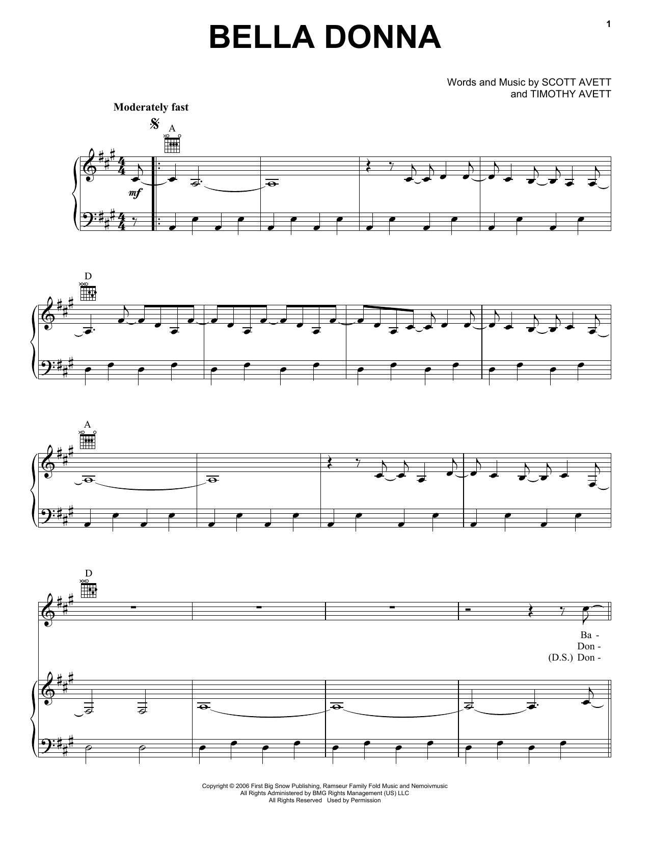 Download or print The Avett Brothers Bella Donna sheet music, chords and digital score arranged for Piano, Vocal & Guitar Chords (Right-Hand Melody). This Pop score includes 3 page(s).