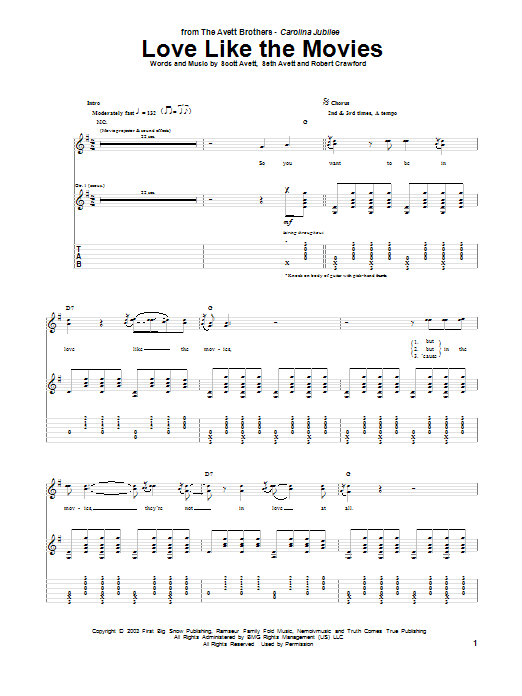 Download or print Avett Brothers Love Like The Movies sheet music, chords and digital score arranged for Guitar Tab. This Pop score includes 5 page(s).