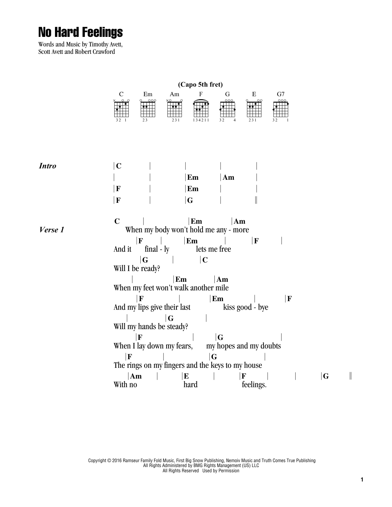 Download or print The Avett Brothers No Hard Feelings sheet music, chords and digital score arranged for Guitar Chords/Lyrics. This Pop score includes 4 page(s).