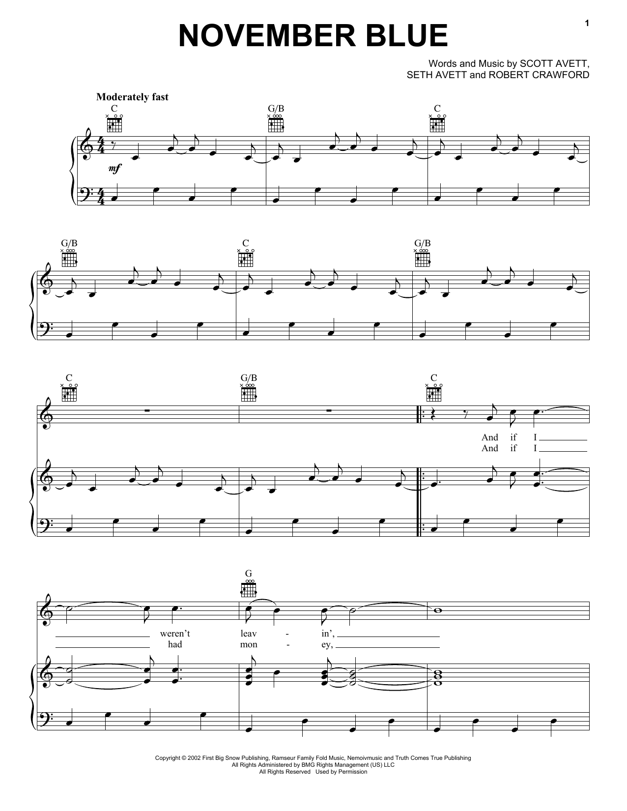 Download or print The Avett Brothers November Blue sheet music, chords and digital score arranged for Piano, Vocal & Guitar Chords (Right-Hand Melody). This Pop score includes 10 page(s).