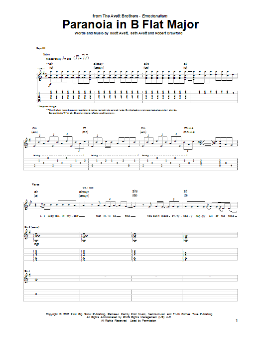 Download or print Avett Brothers Paranoia In B Flat Major sheet music, chords and digital score arranged for Guitar Tab. This Pop score includes 6 page(s).
