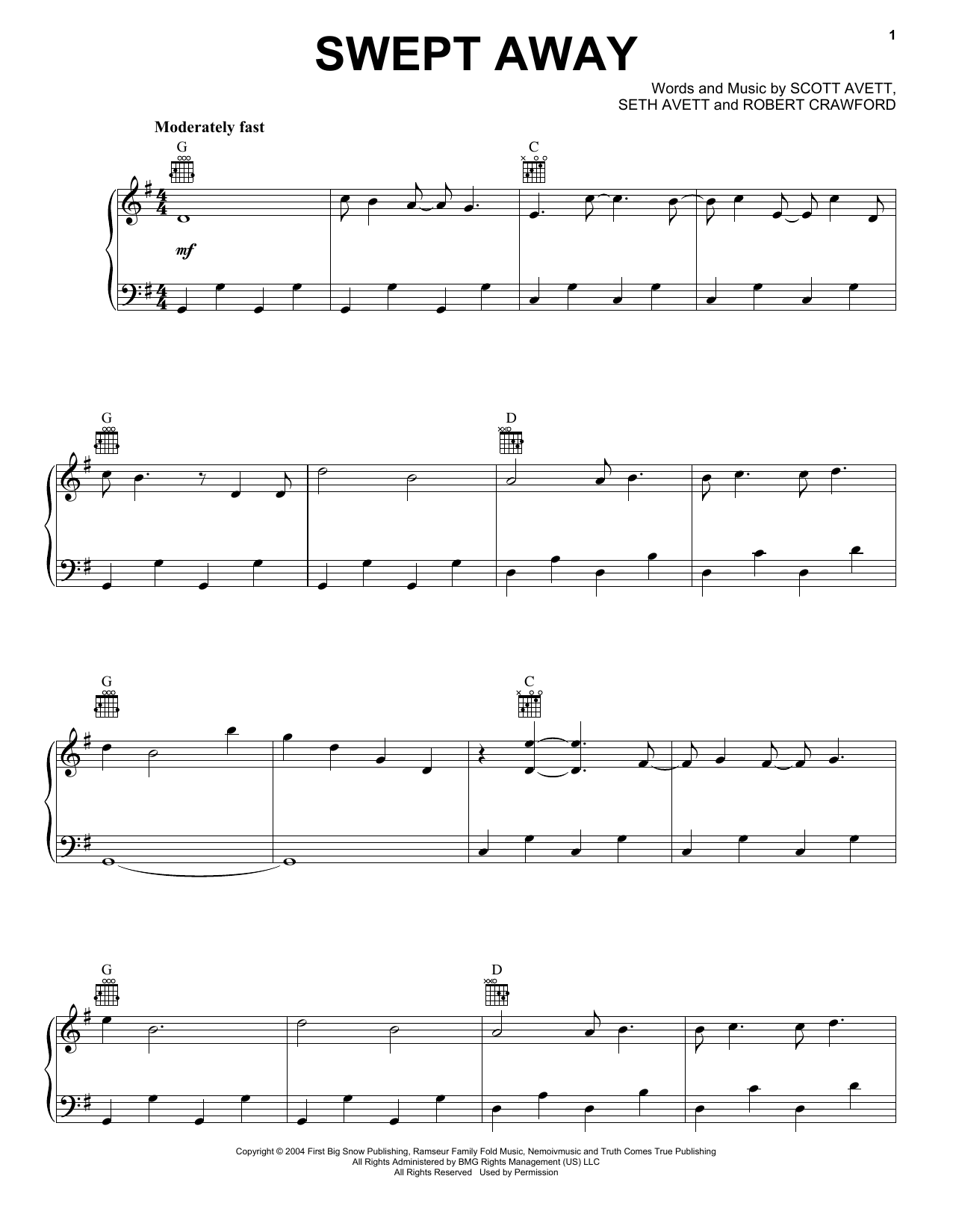 Download or print The Avett Brothers Swept Away sheet music, chords and digital score arranged for Piano, Vocal & Guitar Chords (Right-Hand Melody). This Pop score includes 7 page(s).