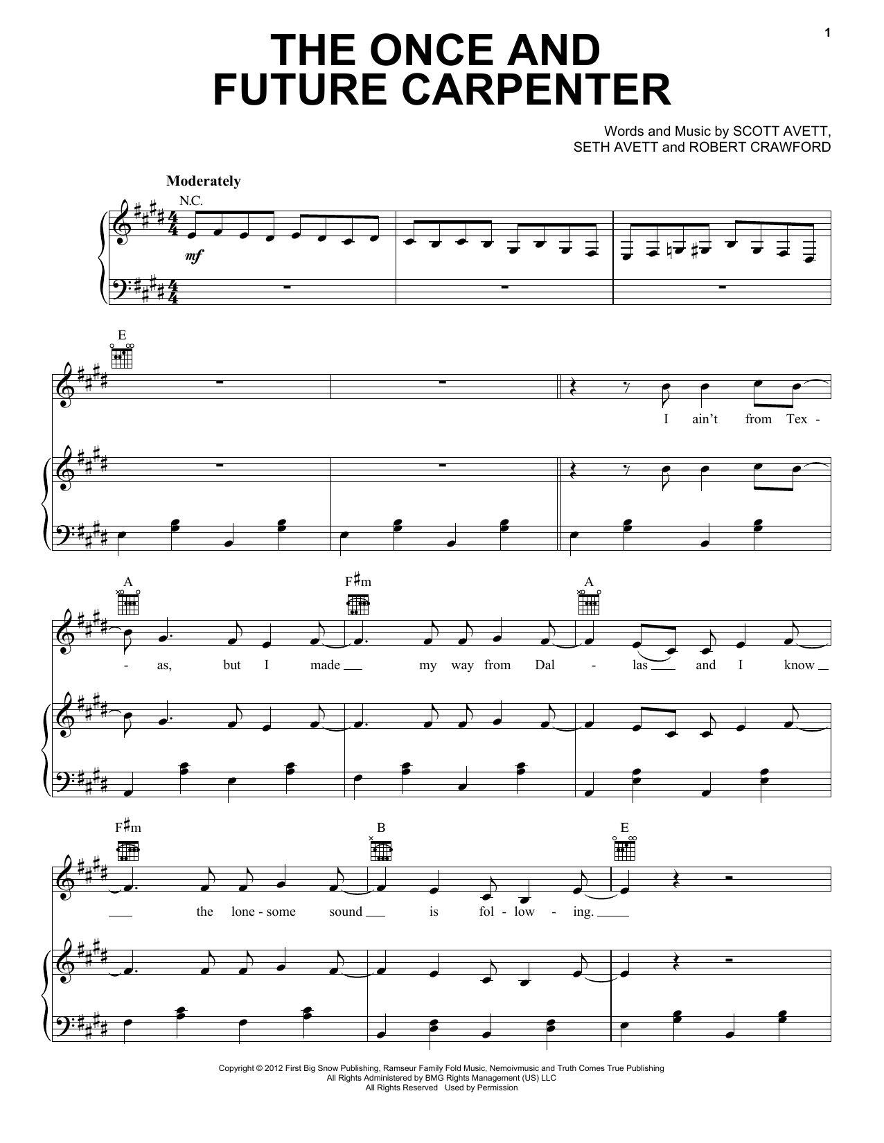Download or print The Avett Brothers The Once And Future Carpenter sheet music, chords and digital score arranged for Piano, Vocal & Guitar Chords (Right-Hand Melody). This Pop score includes 9 page(s).