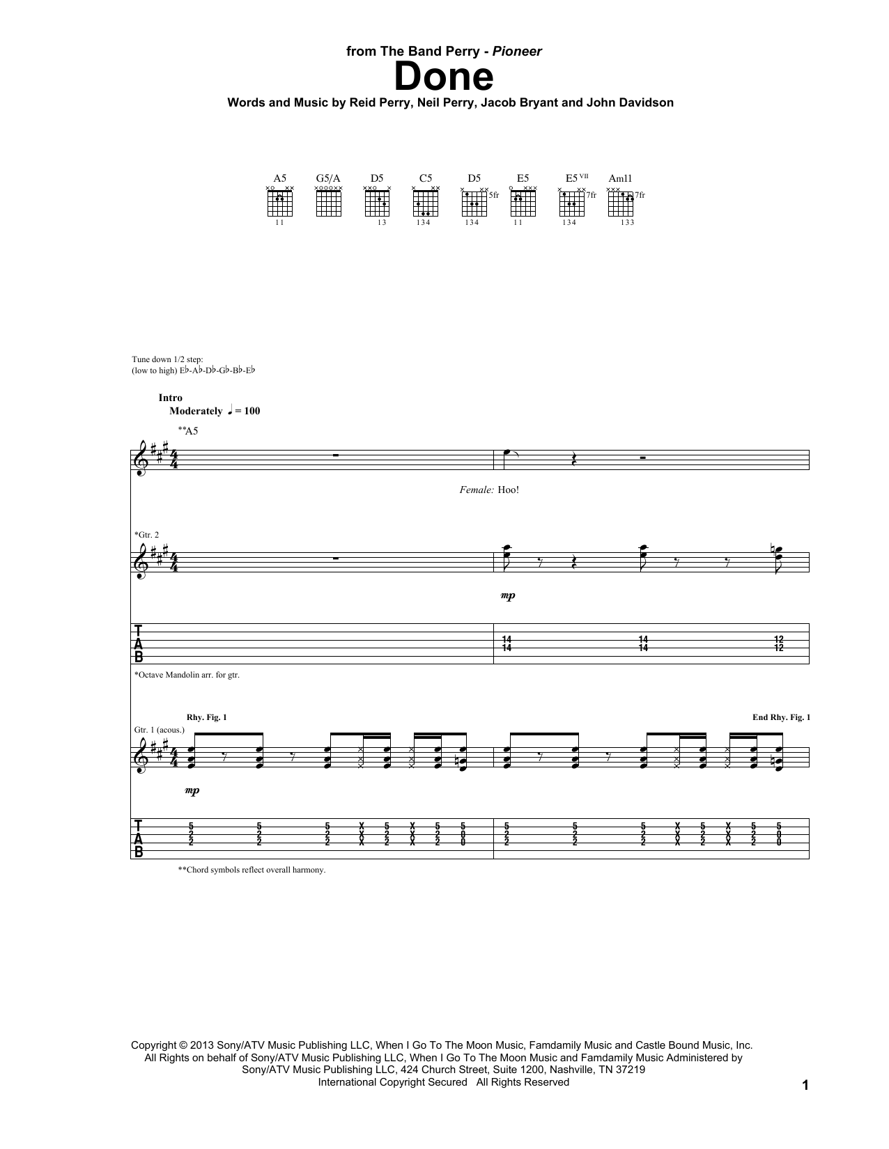 Download or print The Band Perry Done sheet music, chords and digital score arranged for Guitar Tab (Single Guitar). This Pop score includes 9 page(s).