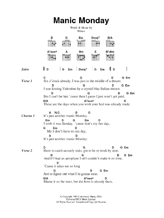 Download or print The Bangles Manic Monday sheet music, chords and digital score arranged for Guitar Chords/Lyrics. This Pop score includes 2 page(s).