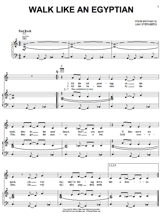 Download or print The Bangles Walk Like An Egyptian sheet music, chords and digital score arranged for Guitar Chords/Lyrics. This Pop score includes 3 page(s).