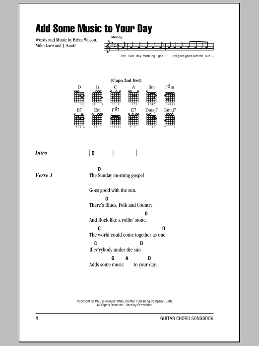 Download or print The Beach Boys Add Some Music To Your Day sheet music, chords and digital score arranged for Guitar Chords/Lyrics. This Pop score includes 2 page(s).