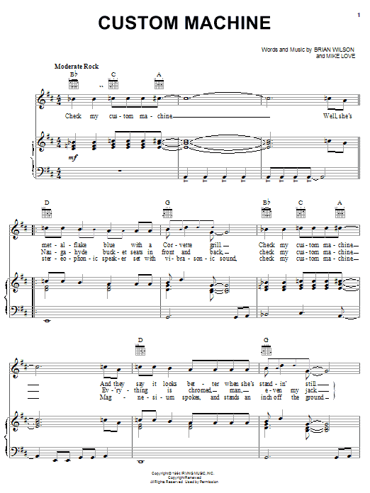 Download or print The Beach Boys Custom Machine sheet music, chords and digital score arranged for Piano, Vocal & Guitar Chords (Right-Hand Melody). This Oldies score includes 2 page(s).