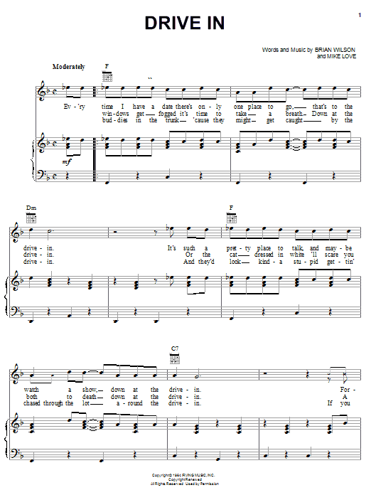 Download or print The Beach Boys Drive In sheet music, chords and digital score arranged for Piano, Vocal & Guitar Chords (Right-Hand Melody). This Oldies score includes 2 page(s).