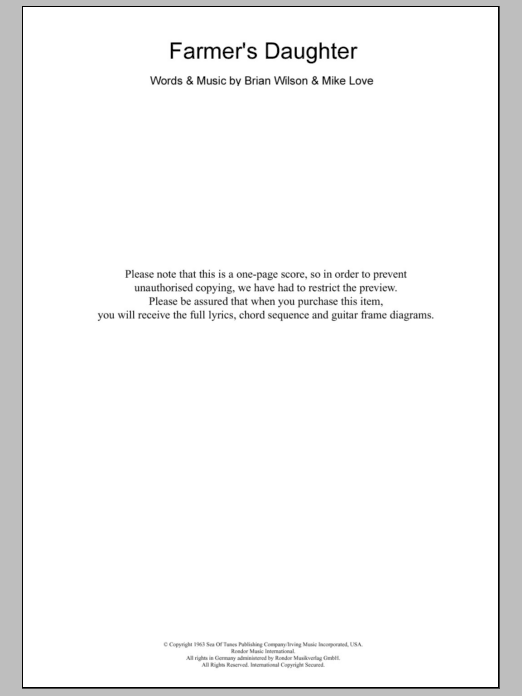 Download or print The Beach Boys Farmer's Daughter sheet music, chords and digital score arranged for Guitar Chords/Lyrics. This Pop score includes 2 page(s).