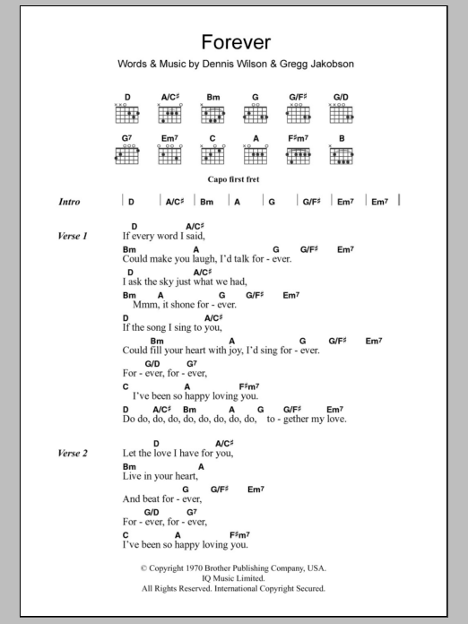 Download or print The Beach Boys Forever sheet music, chords and digital score arranged for Guitar Chords/Lyrics. This Pop score includes 2 page(s).