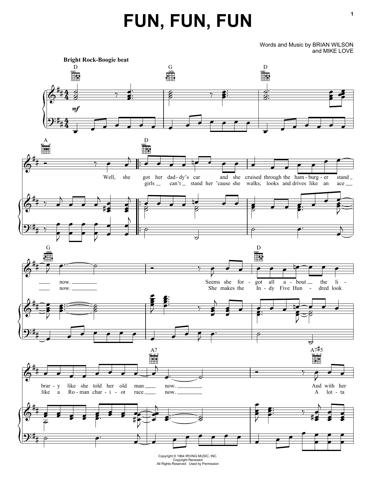 Download or print The Beach Boys Fun, Fun, Fun sheet music, chords and digital score arranged for Easy Piano. This Pop score includes 3 page(s).