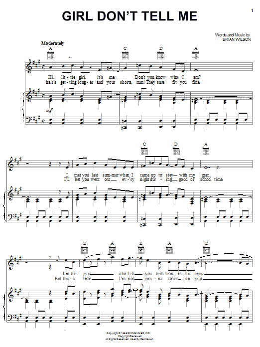 Download or print The Beach Boys Girl Don't Tell Me sheet music, chords and digital score arranged for Guitar Chords/Lyrics. This Pop score includes 2 page(s).