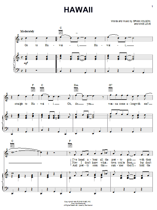 Download or print The Beach Boys Hawaii sheet music, chords and digital score arranged for Lead Sheet / Fake Book. This Pop score includes 2 page(s).