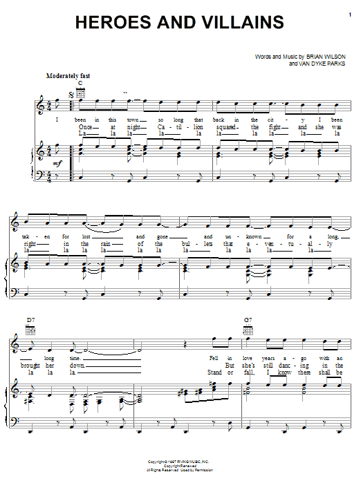 Download or print The Beach Boys Heroes And Villains sheet music, chords and digital score arranged for Piano, Vocal & Guitar Chords (Right-Hand Melody). This Oldies score includes 5 page(s).