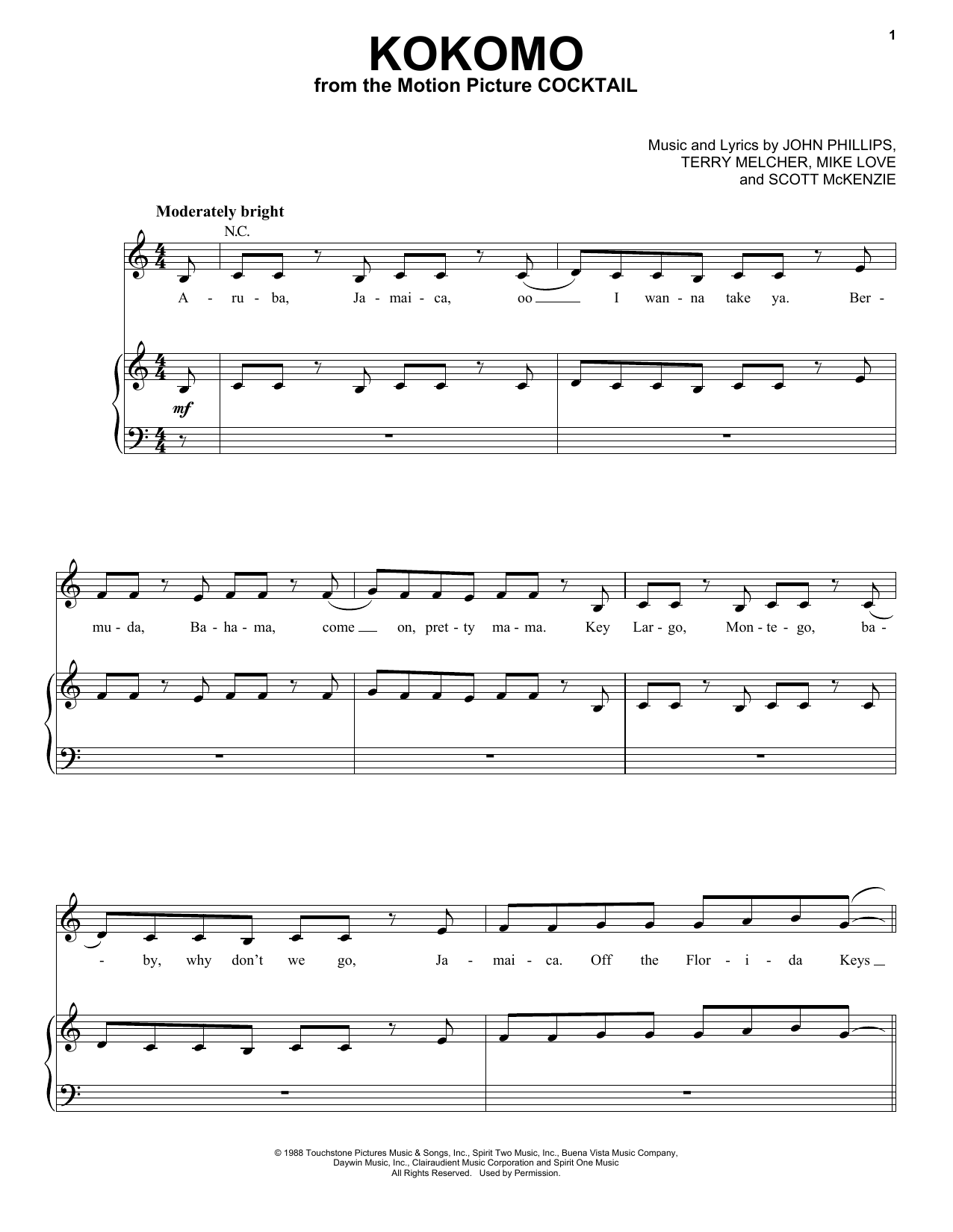 Download or print The Beach Boys Kokomo sheet music, chords and digital score arranged for Big Note Piano. This Disney score includes 7 page(s).