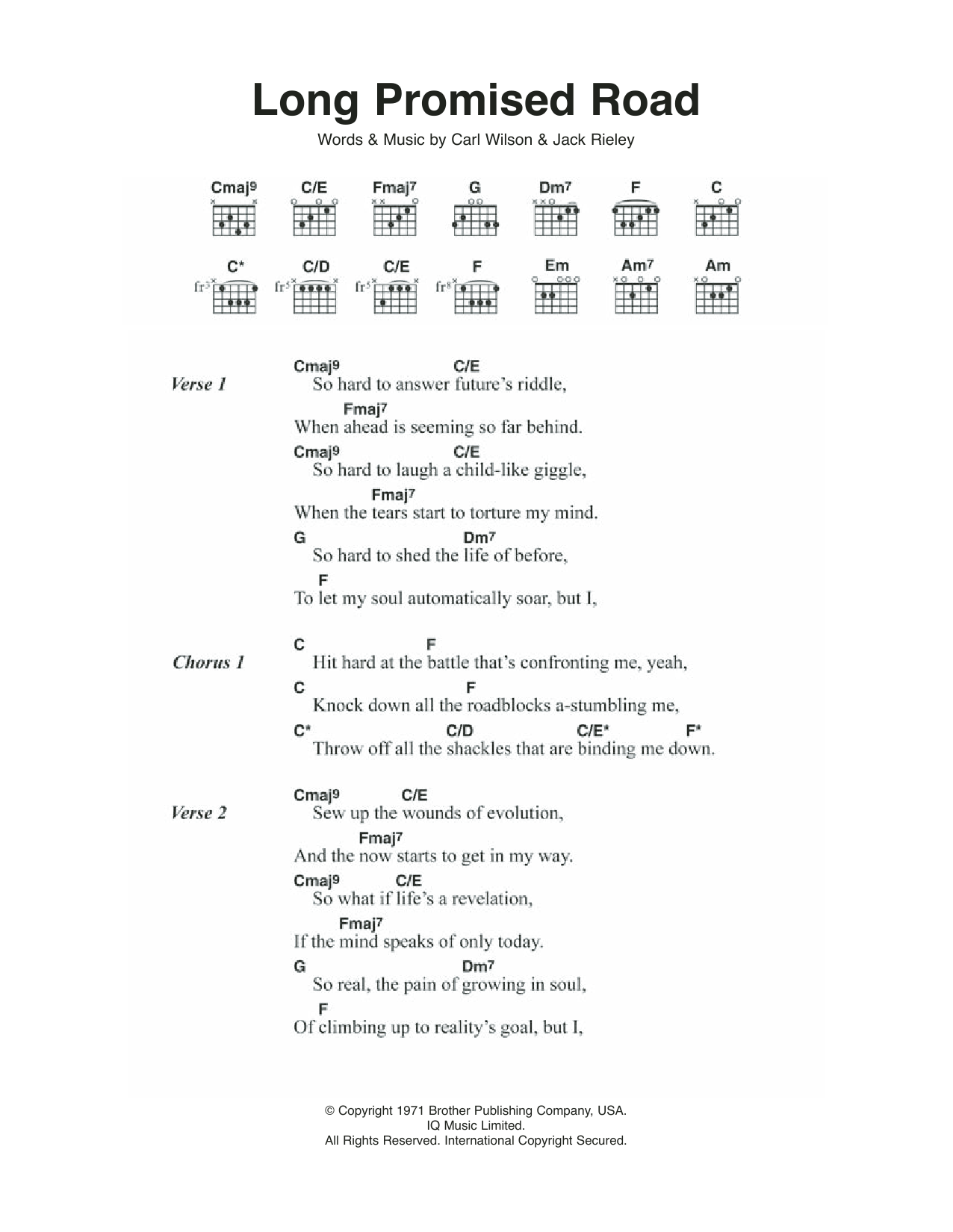 Download or print The Beach Boys Long Promised Road sheet music, chords and digital score arranged for Guitar Chords/Lyrics. This Pop score includes 2 page(s).