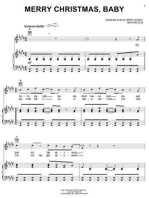Download or print The Beach Boys Merry Christmas, Baby sheet music, chords and digital score arranged for Piano, Vocal & Guitar Chords (Right-Hand Melody). This Christmas score includes 4 page(s).