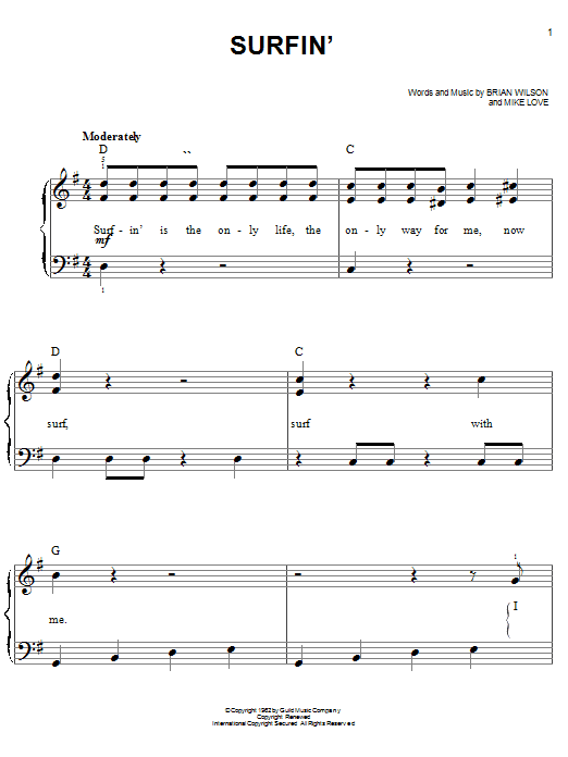 Download or print The Beach Boys Surfin' sheet music, chords and digital score arranged for Easy Piano. This Rock score includes 4 page(s).