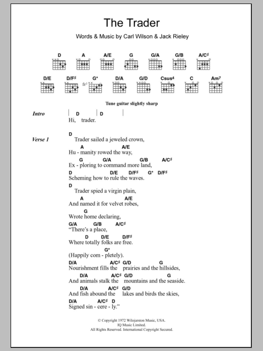Download or print The Beach Boys The Trader sheet music, chords and digital score arranged for Guitar Chords/Lyrics. This Pop score includes 4 page(s).