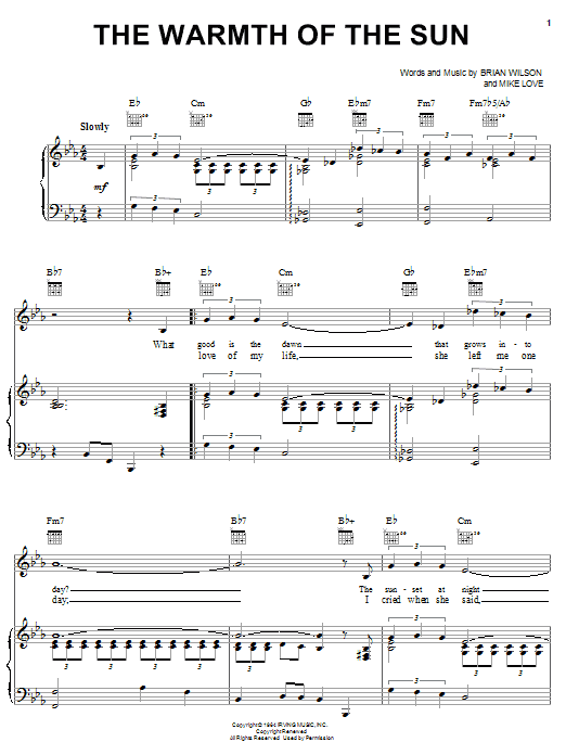 Download or print The Beach Boys The Warmth Of The Sun sheet music, chords and digital score arranged for Guitar Chords/Lyrics. This Pop score includes 2 page(s).
