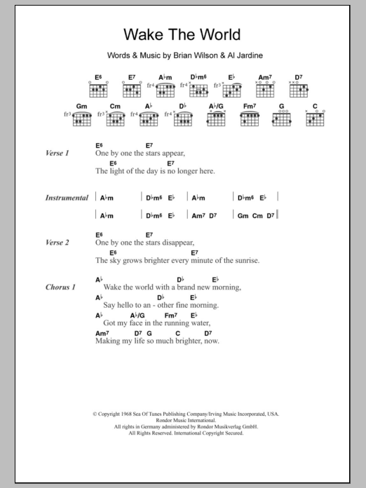 Download or print The Beach Boys Wake The World sheet music, chords and digital score arranged for Guitar Chords/Lyrics. This Pop score includes 2 page(s).
