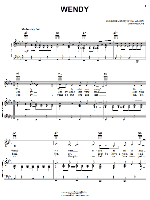 Download or print The Beach Boys Wendy sheet music, chords and digital score arranged for Guitar Chords/Lyrics. This Pop score includes 2 page(s).