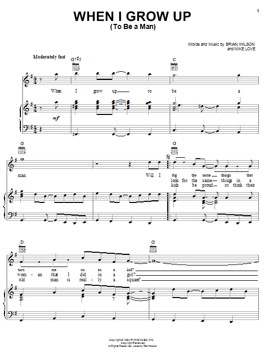 Download or print The Beach Boys When I Grow Up (To Be A Man) sheet music, chords and digital score arranged for Piano, Vocal & Guitar Chords (Right-Hand Melody). This Pop score includes 4 page(s).