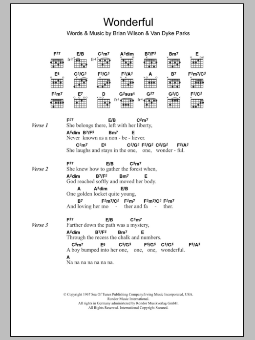 Download or print The Beach Boys Wonderful sheet music, chords and digital score arranged for Guitar Chords/Lyrics. This Pop score includes 2 page(s).