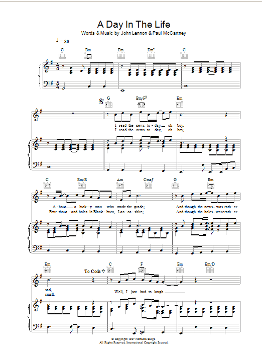 Download or print The Beatles A Day In The Life sheet music, chords and digital score arranged for Trumpet Solo. This Pop score includes 2 page(s).