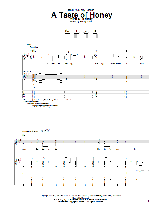 Download or print The Beatles A Taste Of Honey sheet music, chords and digital score arranged for Piano, Vocal & Guitar Chords (Right-Hand Melody). This Pop score includes 3 page(s).