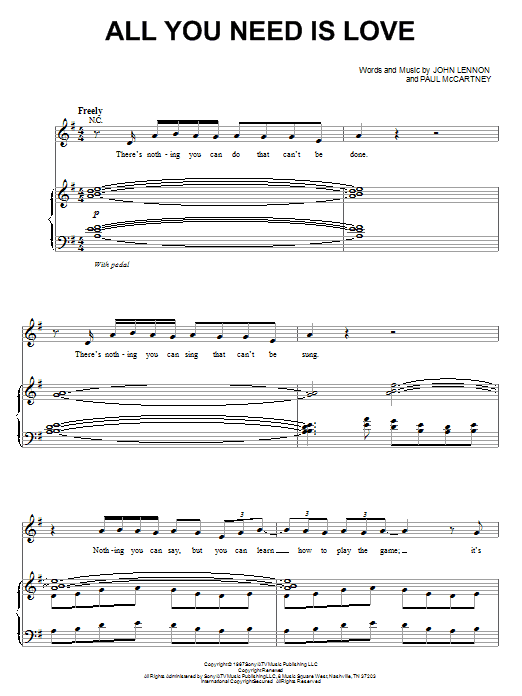 Download or print The Beatles All You Need Is Love (from Across The Universe) sheet music, chords and digital score arranged for Piano & Vocal. This Film/TV score includes 7 page(s).