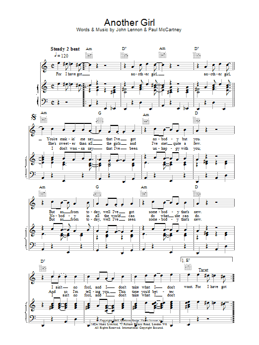 Download or print The Beatles Another Girl sheet music, chords and digital score arranged for Guitar Tab. This Pop score includes 7 page(s).