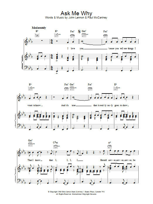 Download or print The Beatles Ask Me Why sheet music, chords and digital score arranged for Guitar Tab. This Pop score includes 6 page(s).