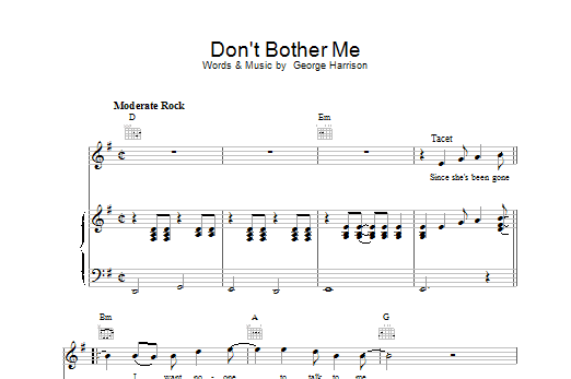 Download or print The Beatles Don't Bother Me sheet music, chords and digital score arranged for Piano, Vocal & Guitar Chords. This Pop score includes 1 page(s).