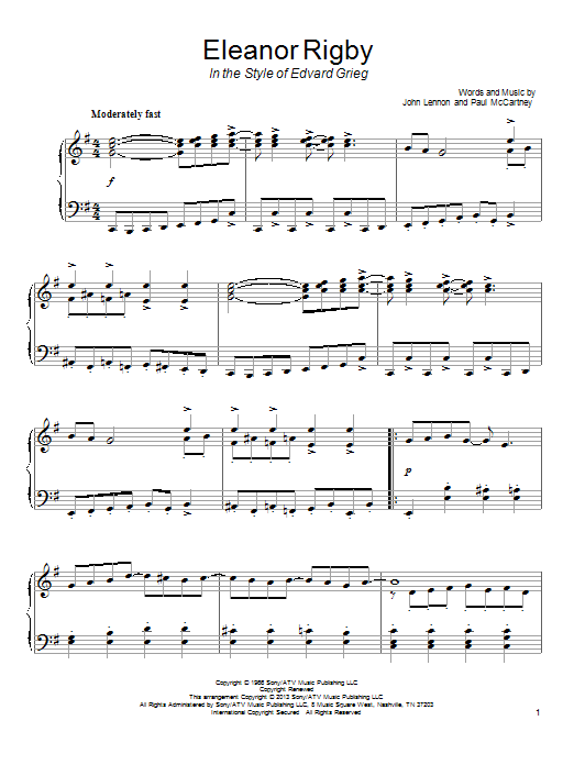Download or print The Beatles Eleanor Rigby (in the style of Edvard Grieg) sheet music, chords and digital score arranged for Piano Solo. This Classical score includes 4 page(s).