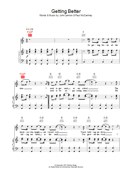 Download or print The Beatles Getting Better sheet music, chords and digital score arranged for Guitar Chords/Lyrics. This Rock score includes 2 page(s).