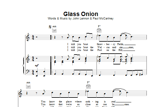 Download or print The Beatles Glass Onion sheet music, chords and digital score arranged for Piano, Vocal & Guitar Chords (Right-Hand Melody). This Pop score includes 4 page(s).