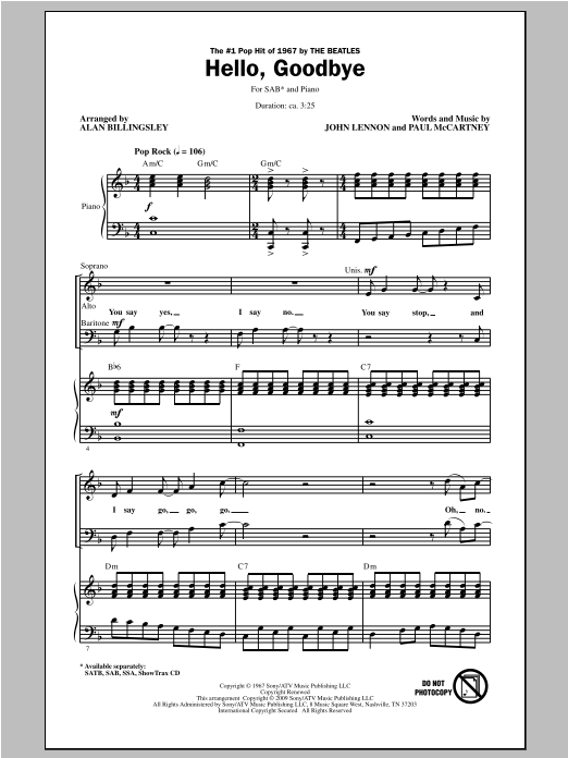 Download or print The Beatles Hello, Goodbye (arr. Alan Billingsley) sheet music, chords and digital score arranged for SATB Choir. This Pop score includes 11 page(s).
