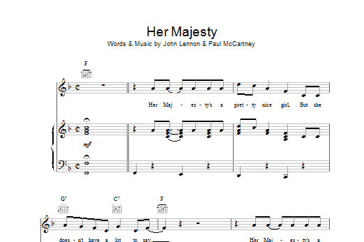 Download or print The Beatles Her Majesty sheet music, chords and digital score arranged for Piano, Vocal & Guitar Chords. This Pop score includes 1 page(s).